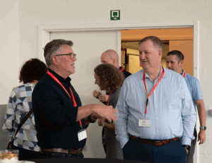 Left to right: AdvantageCS gathers for a company photo (2025), clients explore new features during an Advantage Academy training session (2018), Director of European Operations Philippe van Mastrigt and VP Dan Heffernan give a presentation at FIPP World Media Congress (2024), and Director of Client Services Scott Ghormley chats with European clients (2025).