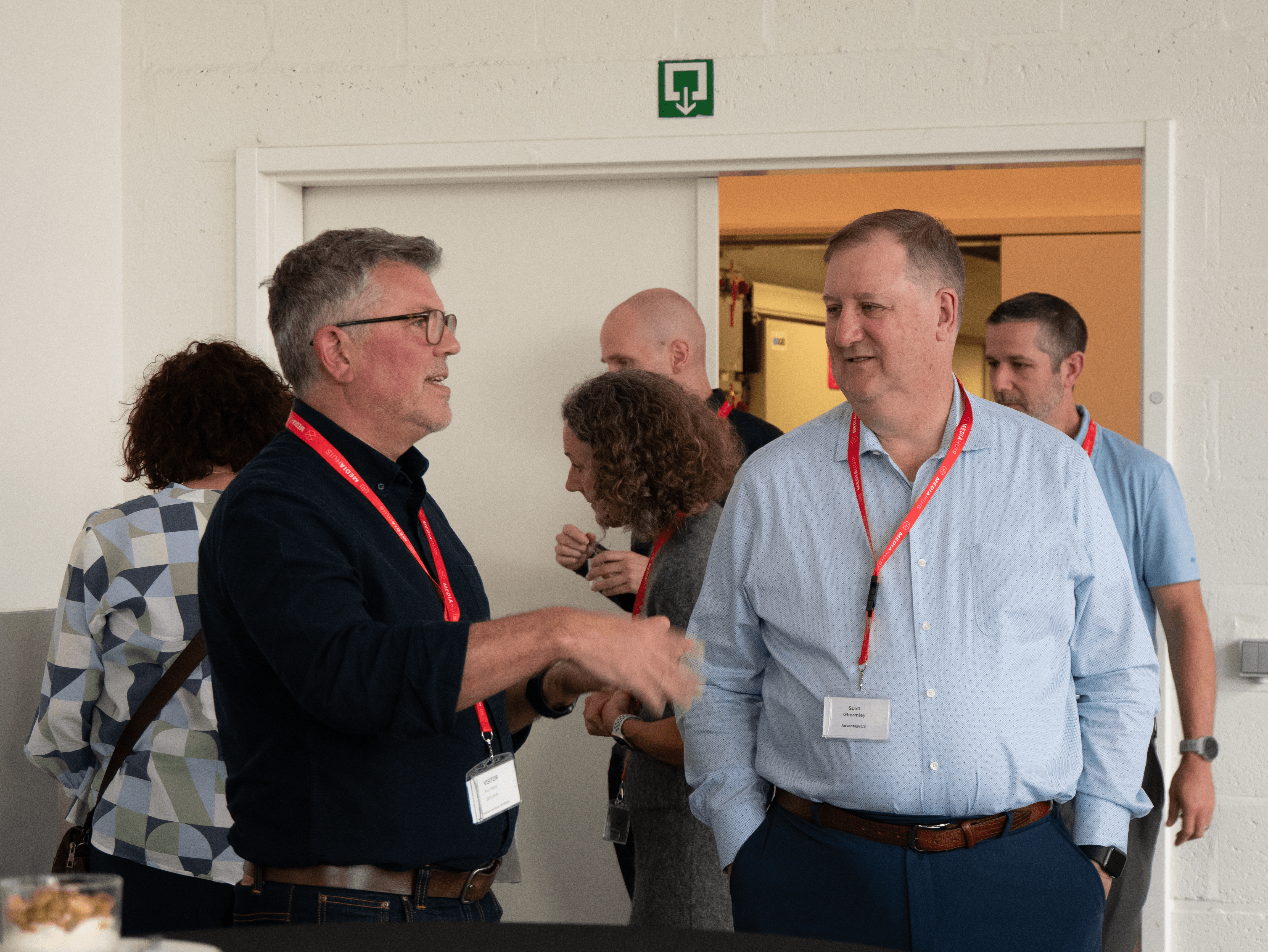 Left to right: AdvantageCS gathers for a company photo (2025), clients explore new features during an Advantage Academy training session (2018), Director of European Operations Philippe van Mastrigt and VP Dan Heffernan give a presentation at FIPP World Media Congress (2024), and Director of Client Services Scott Ghormley chats with European clients (2025).